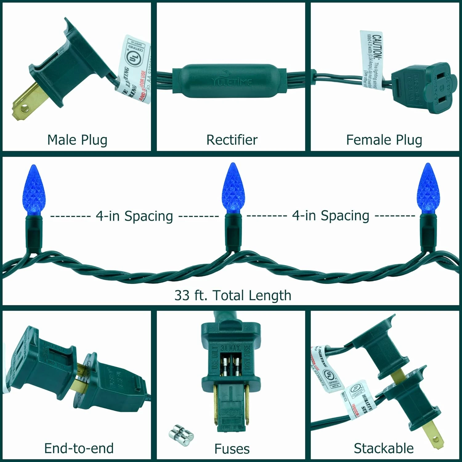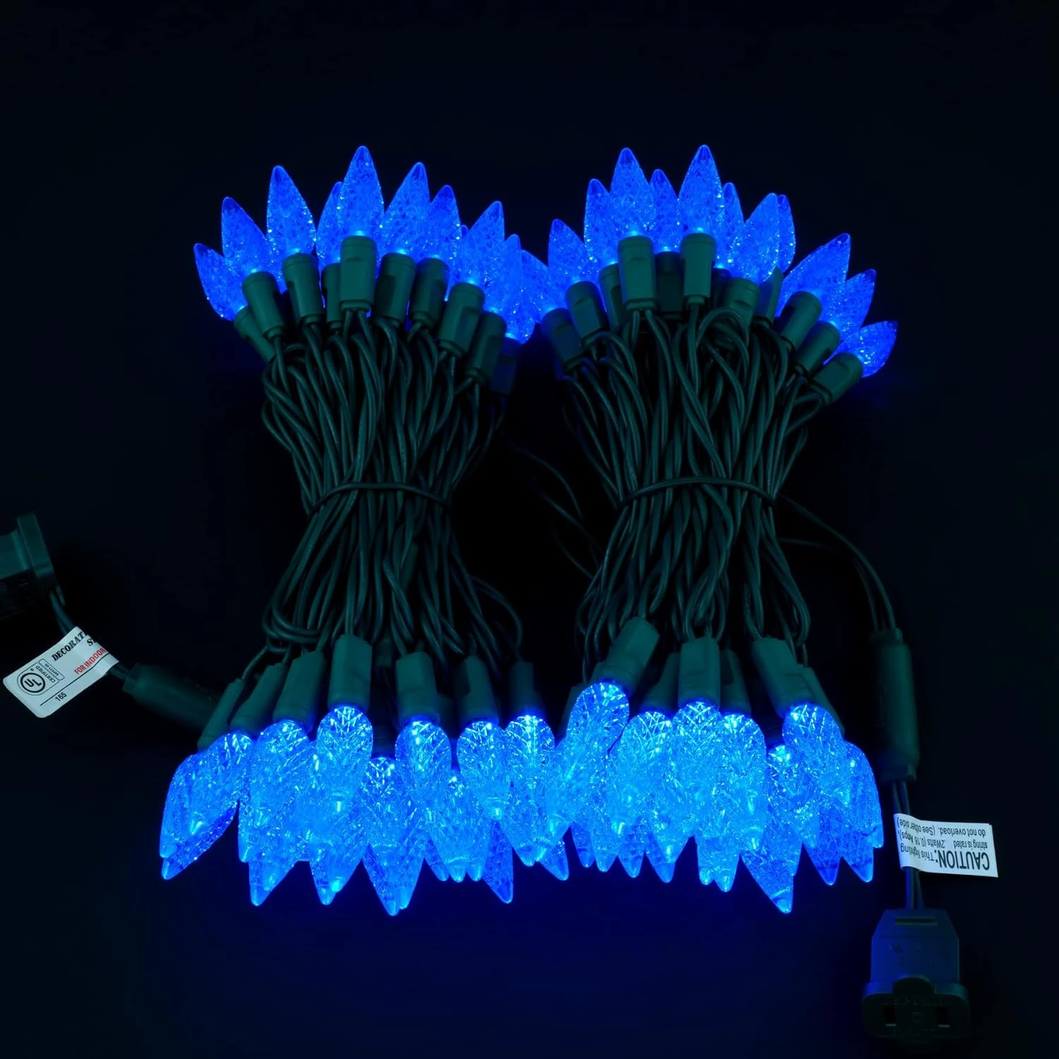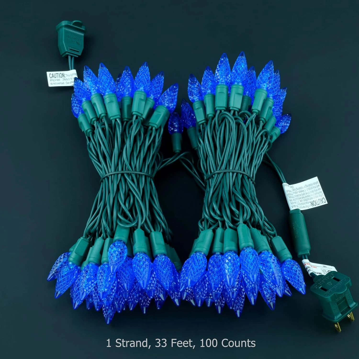 - SPECIFICATIONS ♥ 100 count blue C6 strawberry LED bulbs on green wire, total length of lighted section is 33 feet, 4-inch spacing, 4-inch lead, 4-inch tail. Female plugs and stackable male plugs can be connected to provide extended use of end-to-end connections. The actual power of the whole string of lights is 7.2 watts and the rated maximum connected power is 216 watts with up to 30 strands running simultaneously.