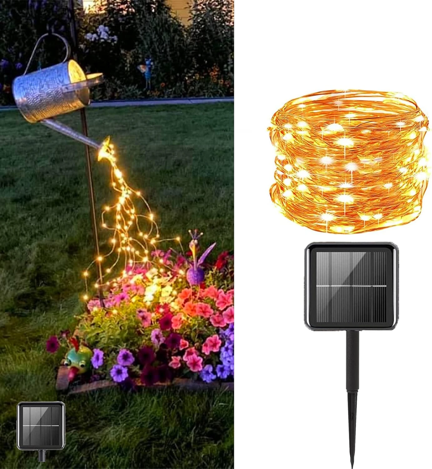 - 【Environmental Protection and Easy Installation】100% solar powered. A built-in light sensor guarantee that the watering can lights can turn on at dusk and turn off by dawn automatically. Requires no external wiring, the solar panel can supply power for more than 8 hours. It requires no battery and is easy to install. You just need to plug it into the ground to charge the solar panel towards the sun.